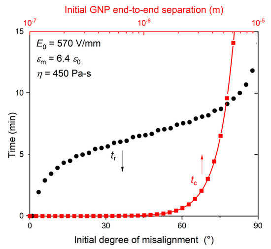 Rotational time (in black, tr) required for individual GNP to become aligned with electric field as a function of initial degree of misalignment (bottom x-axis), and translational connection time (in red, tc) for two aligned GNP to form end-to-end connection as a function of initial distance of separation (top x-axis). The melt viscosity and dielectric constant of the polymer matrix correspond to our EVA/GNP composite at 160 °C under the experimental conditions.