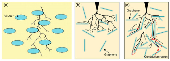 Schematic diagram of electric tree growth through (a) polymer/insulating silica particle composite with good particle dispersion, and (b,c) a polymer/graphene composite in which graphene within a local area is (b) at low concentrations and evenly dispersed or (c) at higher concentrations and poorly dispersed. In (a), tree growth proceeds in the area without particles but is hindered near the polymer/particle interface. Treeing process strongly depends on particle dispersion if conductive particles such as graphene are used. (b) Graphene is locally well-dispersed and tree formation is inhibited by electric field distortion along the polymer/graphene interface. (c) Local graphene agglomerates create locally conductive regions (highlighted in red) with lower dielectric strength that accelerate electrical treeing. Figure (a) is adapted with permission from Ref. [3]. Copyright © 2009, IEEE. Figures (b,c) are adapted with permission from Ref. [27]. Copyright © 2019 by the authors.