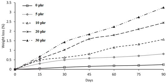 Biodegradability is one of the most important features of natural fibers, making them interesting for polymer composites. Abdel-Hakim et al. [] studied the biodegradation of sisal fiber/NR composites of different filler contents using simulated soil containing equal parts soil, sand and animal manure. The samples were buried under a layer of soil (1 cm) with a pH of 7.5. The biodegradation period was 90 days, and the weight loss was measured every 2 weeks. Figure 1 shows the weight loss of sisal fiber/NR composites as a function of filler content. The weight loss of neat NR was 0.25% after 90 days, while this value for the composites containing 5, 10, 20 and 30 phr of sisal fiber was 0.81%, 1.57%, 2.44% and 3.25%, respectively. It was found that the degree of biodegradability increased with increasing the amount of sisal fiber in NR composites. The authors also reported that, although coating the sisal fibers with a hydrophobic polymer (styrene butyl acrylate) improved the mechanical properties of NR composites, this treatment resulted in lower weight loss during biodegradation. Similar results were obtained by Jacob et al. []. They confirmed that the biocomposite weight loss in soil increased with natural fiber (sisal and oil palm) addition to NR, but performing chemical treatments (mercerization and silanization) on the fibers reduced the biodegradability.