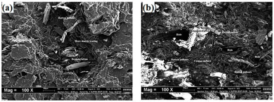 SEM micrographs of the tensile fracture surface of NR composites filled with (a) 5 phr and (b) 30 phr rattan powder (reproduced with permission from []).