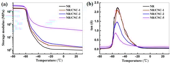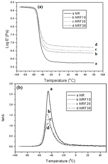 (a) Storage modulus and (b) loss factor (tan δ) as a function of temperature for NR composites filled with different contents of untreated oil palm fiber. NRFx denotes oil palm/NR composites, where x is the filler content in phr (adapted with permission from []).
