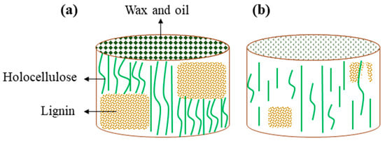 Alkali treatment is one of the simplest treatments for NF, and Figure 4 presents the mechanism involved. In this technique, sodium hydroxide (NaOH) is used to remove waxes, natural fats and other impurities from the surface of natural fibers. Therefore, the alkali treatment increases the surface area available for bonding with the matrix, improves surface roughness and decreases the surface tension of the filler. After an alkali treatment, the fiber diameter decreases and the fiber aspect ratio increases [,]. Moreover, the alkali treatment partially removes the amorphous regions (hemicellulose and lignin) from the fibers, leading to higher crystallinity [,].