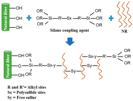 Silane coupling agents are widely used for silica-filled NR composites, as they chemically react with both the filler and the matrix and thus significantly improve the fiber-matrix interfacial adhesion (Figure 5). Bis(3-(triethoxysilyl) propyl) tetrasulfide (TESPT) is the most common silane coupling agent for NR composites [].