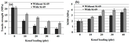 (a) Tensile strength and (b) modulus at 300% strain of kenaf fiber/NR composites before and after treatment with TESPT as a coupling agent (adapted with permission from []).