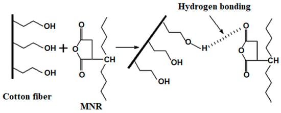 Schematic representation of the interaction between cotton fiber and MNR through hydrogen bonding (reproduced with permission from []).