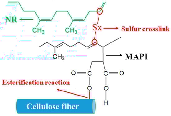 Maleated natural rubber (MNR) is obtained via NR chemical modification by blending maleic anhydride with NR. As shown in Figure 7, MNR can form a hydrogen bond with the hydroxyl groups of cellulose, thus improving interfacial adhesion and composite mechanical properties. Some work used MNR as a compatibilizer for NF/NR composites and reported mechanical property improvements using this compatibilizing strategy [,,,,]. Zeng et al. [] observed that the tensile strength of NR composite with 10 phr MNR at 10 phr cotton fiber was 11% higher than that without MNR.