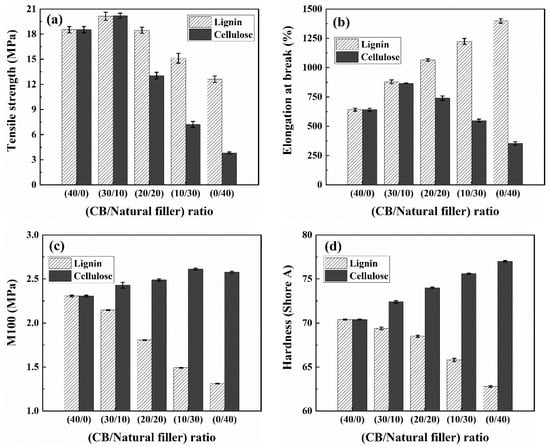 Mechanical properties of NR composites filled with cellulose and lignin at different concentrations: (a) tensile strength, (b) elongation at break, (c) modulus at 100% elongation and (d) hardness (reproduced with permission from []).