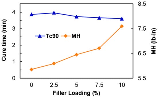 Since NF are stiffer than NR, their addition leads to a restriction in the deformation and mobility of rubber chains, increasing the compound viscosity. The minimum torque and maximum torque are increased with their addition, and more energy is required to process the rubber compounds. As a result, more heat is generated due to additional friction (viscous dissipation), leading to shorter scorch time and optimum cure time [,,,,,]. For example, the curing characteristics of NR composites filled with coconut shell powders are reported in Table 2.