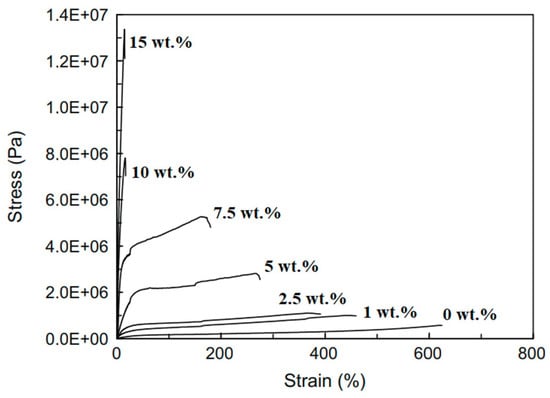 Roy et al. [,] showed that adding 5 phr of MCC to NR improved the tensile strength by 13–16%. However, other studies showed that the tensile strength decreased when more than 10 phr of MCC was used in NR composites due to poor filler dispersion and poor filler–matrix compatibility [,,]. For example, Chuayjuljit et al. [] reported that the tensile strength decreased by about 50% when the MCC content increased from 0 to 30 phr. However, cellulose modifications can improve the mechanical properties of NR composites. Deng et al. [,] reported that the tensile strength of NR composite containing 5 phr MCC was 9% higher than that of unfilled rubber, which can be increased up to 32% after grafting MCC with ethyl acrylate, butyl acrylate or methyl methacrylate monomers.