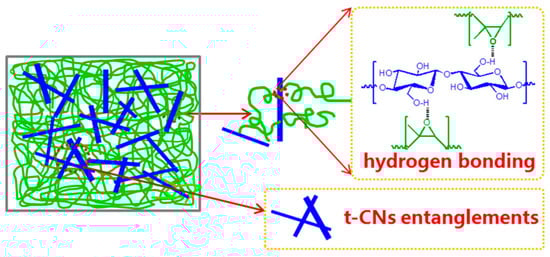 Unlike macro-sized lignocellulosic fillers, which are mainly known as non-reinforcing fillers for NR, nanocellulose can be used to greatly improve all mechanical and dynamic mechanical properties of NR compounds. Jong et al. [] showed that NF can change from non-reinforcing fillers to reinforcing fillers by decreasing the filler size from the macro level to the nano level. One of the greatest advantages of nanocellulose arises from its high dispersion in water. Since NR latex is also an aqueous suspension, a uniform filler distribution is achieved in the rubber matrix when nanocellulose is added to the NR latex. Moreover, during the casting/evaporation step, the nanocellulose particles move closer to each other due to their hydrophilic heads (OH functional groups) through hydrogen bonding attractions forming a strong continuous 3D network in the matrix. This network is the origin of NR nanocomposite reinforcement [].