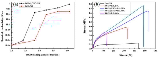 - Xiong, X.-Q.; Bao, Y.-L.; Liu, H.; Zhu, Q.; Lu, R.; Miyakoshi, T. Study on Mechanical and Electrical Properties of Cellulose Nanofibrils/graphene-Modified Natural Rubber. Mater. Chem. Phys. 2019, 223, 535–541. [Google Scholar] [CrossRef]