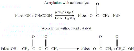 Reaction mechanism of fiber acetylation with and without acid catalyst (reproduced with permission from []).