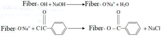 Benzoylation uses benzoyl chloride to decrease the hydrophilic nature of fibers and increase interfacial adhesion, thereby improving the mechanical properties of NR composites. This treatment is generally performed after an alkali pre-treatment by replacing hydroxyl groups with benzoyl groups (C6H5CO-), as shown in Scheme 2 []. Lopattananon et al. [] used a benzoyl peroxide treatment and reported that the tensile strength of NR composite with 20 phr of pineapple leaf fiber was improved by 57%. They also reported that benzoyl peroxide treatment gave better results than alkali treatment.