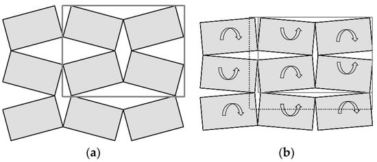 Illustration of the rotation mechanism of 2D structure with rotating unit cells, which creates NPR effect. Rigid units (a) before rotation and (b) after rotation.