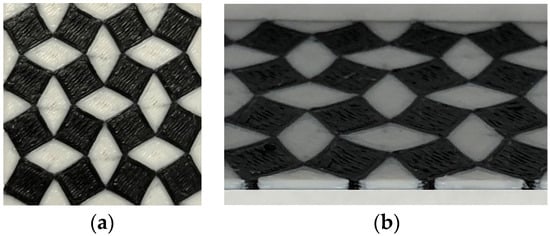 Multi-material additive manufacturing is one of the techniques that can be employed to create architected bi-material plates [63,75]. Matrix and inclusions should be selected from materials that develop a strong adhesion to each other [76,77]. Figure 3 shows an example of an architected plate fabricated by multi-material additive manufacturing. The hard matrix is from carbon fiber reinforced PLA, and the soft inclusions are from PLA.