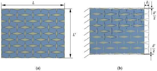 Poisson’s ratio and Young’s modulus of architected bi-material auxetic plates can be determined by finite element analysis. The finite element analysis was performed using Ansys 2019 version (ANSYS Inc., Canonsburg, PA, USA), and 3D solid tetrahedral and hexahedral elements with quadratic element order were used to mesh the architected plates in this study. The length and width of the architected plate are L and L’, as shown in Figure 4a. The left side of the plate is fixed, and a longitudinal deformation of δ is applied on the right side of the plate, as shown in Figure 4b. The maximum total lateral deformation, δ’, is determined from finite element simulation. Therefore, the strains along the length of the plate, ε, and along the width, ε’, are defined as