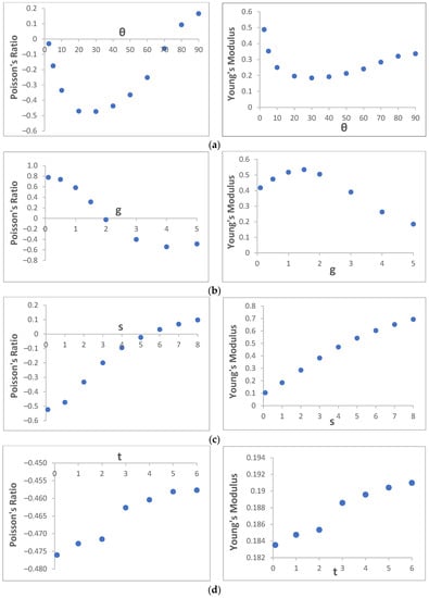 Effects of design parameters (a) θ, (b) g, (c) s, (d) t, and (e) λ on Poisson’s ratio and Young’s modulus of the bi-material plate.