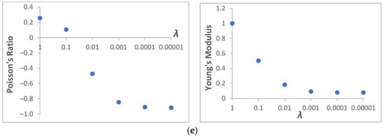 In Figure 7e, λ is a variable (0.00001 ≤ λ ≤ 1), and other parameters are set to a = g = 5, s = t = 1, and θ = 30°. The Poisson’s ratio and Young’s modulus obtain their minimum values of −0.92 and 0.08 at the smallest value of λ (i.e., λ = 0.00001). This shows that having porosity instead of soft inclusions increases the auxetic behavior of the plate and yields a more flexible plate. The Poisson’s ratio obtains a zero value at λ = 0.058.