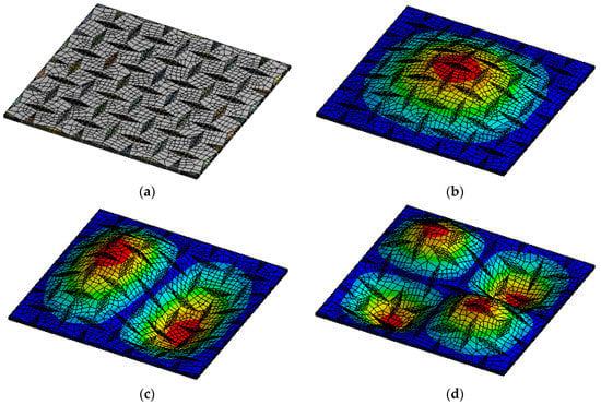 Mode shapes of vibration of the architected plate with clamped boundary conditions obtained by finite element analysis. (a) The undeformed plate; the (b) first, (c) second, and (d) third mode of vibration.