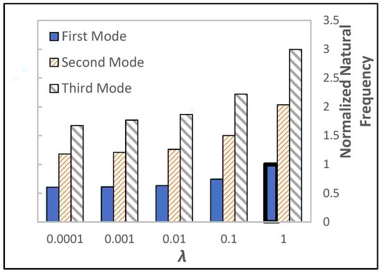Figure 9 presents the natural frequencies of the first three modes of vibration of the architected plate with different values of λ. All frequencies are normalized to the first natural frequency of the plate with λ = 1. It is assumed that both the hard matrix and soft inclusions have the same density (). For example, the first natural frequency for the homogenous plate (i.e., λ = 1) with Eh = Es = 1 GPa, 0.25, 1000 kg/m3, a = g = 5 mm, s = t = 1 mm, and θ = 30° is 526.34 Hz, which is the frequency that all frequencies are normalized to in the chart. It can be observed that by reducing λ, the natural frequencies decrease as well.