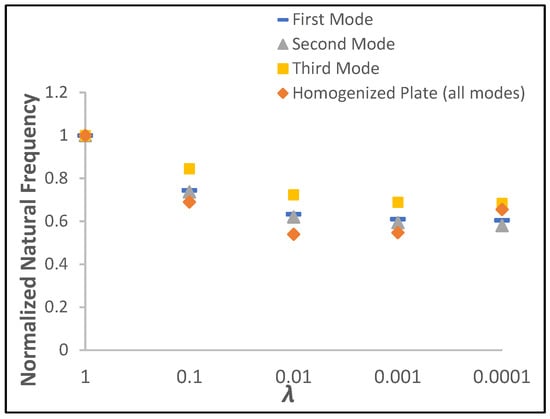 Figure 10 presents the natural frequencies of the first three modes of vibration that are normalized to the natural frequency of the plate with λ = 1 of the corresponding vibration mode. The comparison of these natural frequencies to the natural frequencies of a homogenized plate is also given in Figure 10. The natural frequencies of a homogenized plate were calculated based on Equation (5), using the Young’s modulus and Poisson’s ratio that were obtained from finite element analysis of the architected plate at each λ. The natural frequencies of a homogenized plate are then normalized to the natural frequency of the plate with λ = 1 of the corresponding vibration mode, which gives the same value at each λ for all modes of vibration, as can be seen in Figure 10.