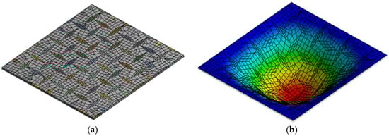 Finite element model of (a) undeformed architected plate and (b) deformed architected plate under uniform lateral loading.