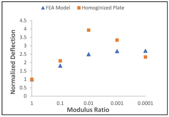 Figure 12 presents the lateral deflection at the center of the architected plate under lateral pressure that is normalized to the lateral deflection of the center of a plate with λ = 1 under the same loading condition. As stated in Equation (6), the lateral deflection of an isotropic homogeneous rectangular plate under lateral pressure depends on its Young’s modulus and Poisson’s ratio, which vary by the change in λ. The comparison of the results to the lateral deflection at the center of an isotropic elastic rectangular plate with the same Young’s modulus and Poisson’s ratio is also presented in Figure 12. As shown in the dynamic response, the homogenization technique provides a reasonable estimate for the static response of the architected plate over the high and low range of λ. Contrarily, it gives a poor estimate for λ values in between, as demonstrated in Figure 12. This is due to the fact that under direct loading, soft inclusions cannot freely deform, as they are bounded by the hard matrix. However, this condition does not apply to the equivalent homogenized plate, and therefore, a larger deformation can be observed. The effect of this condition decreases when the inclusions are made of harder materials, or they can be considered porosity when they are extremely soft.