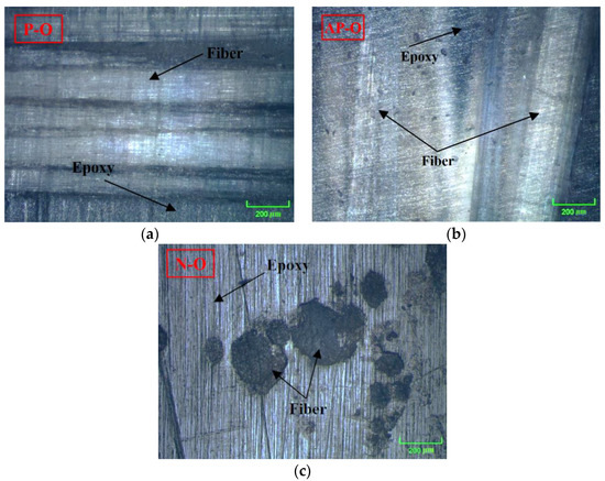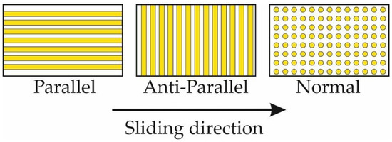 Figure 2a–c show a representative appearance of the contact surface before testing for different fiber orientations, parallel, anti-parallel and normal. Utilizing the optical microscope, presented images show that fiber detection can be difficult, due to insufficient reflection of the surface layer and transparency of the epoxy matrix, as well as the direction of fine grinding identical to the parallel direction of fibers.