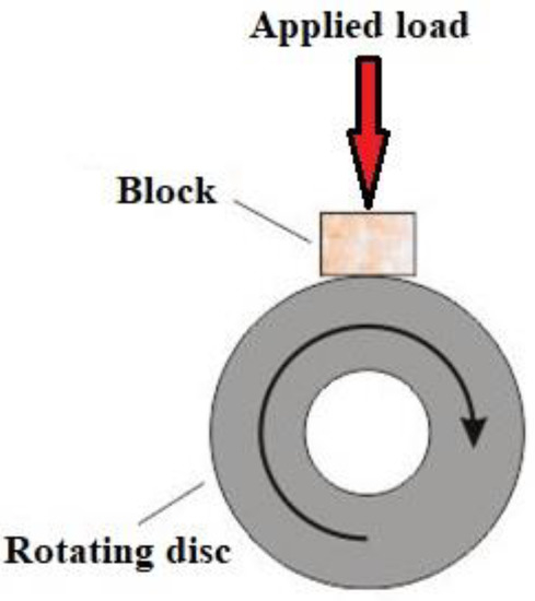 Frictional and wear test of the EACs and NE was conducted using block-on-disc (BOD) configuration, presented in Figure 3, following ASTM G77 standard. The sample was fixed in a rectangular holder and loaded with normal force (35 N and 45 N), with sliding distance of 800 m and sliding velocity of 0.8 m/s. Respecting the sliding direction, the samples were placed in the holder in the direction of P-O, AP-O and N-O. Friction and wear tests were conducted for each orientation, applied load, and volume fraction of abaca fiber. The tests were repeated three times. For comparison purposes, the neat epoxy samples were tested as well. In total, 30 samples were tested. EACs and NE were tested against the 90MnCrV8 steel rotating disc counterface of nitrated surface layer and hardness of 60–62 HRC. Before and after the run of each test, the specimen and counterface were cleaned with 70% ethyl alcohol solution to remove any impurity that increases the abrasive wear of materials in contact.
