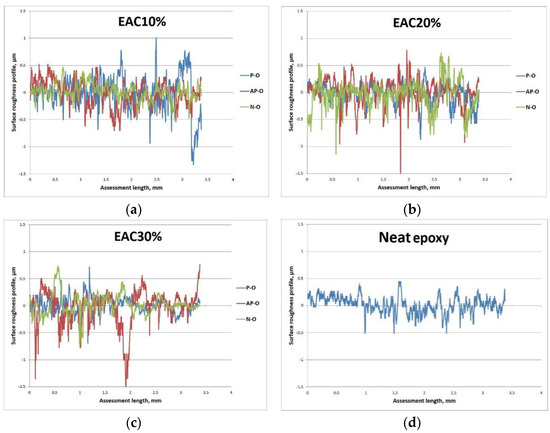 In addition to the numerous values of the roughness parameters, the roughness profiles are provided, one for each type of material. Figure 4 shows the roughness profiles of epoxy/abaca composite materials for the volume fraction of 10%, 20% and 30% of abaca fiber, as well as neat epoxy.