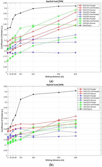 Coefficient of friction of EACs and neat epoxy per sliding distance: (a) 35 N applied load and (b) 45 N applied load.