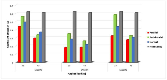 Coefficient of friction of EACs and neat epoxy, per two applied loads, after 800 m of sliding distance.