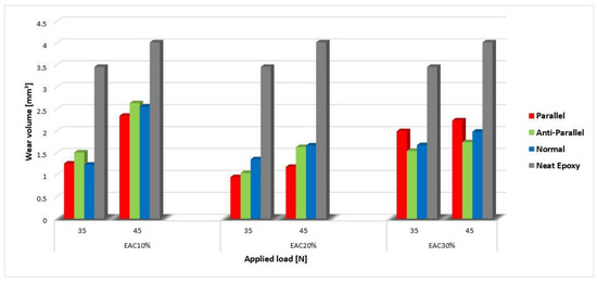 The values of wear volume are given depending on the applied load and the fiber orientation, after 800 m sliding of the rotating disc against EACs and NE specimens. From Figure 7, it can be seen that the wear volume increases with increasing applied load. This trend occurs in all tested materials and all types of fiber orientation, and a significant increase in the wear volume of neat epoxy was observed between 3.462 and 4.022, while increasing the applied load from 35 N to 45 N, respectively.