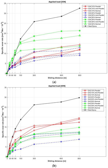 Specific wear rate of EACs and neat epoxy: (a) 35N applied load and (b) 45N applied load.