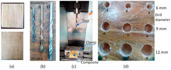 The high-speed steel (HSS) drill bit was used to drill the woven and unidirectional enset–sisal hybrid composites on a CNC center-drill machine. The thickness of the prepared composites was 5 mm. The specimens were cut to a size of 100 × 50 × 5 (mm) and held in a rigid fixture attached to the machine table. The back of the specimen was supported (illustrated in Figure 1) by flat wood to avoid any damage during the drilling operation. The machining condition for the drilling operation in this work was the dry condition, and this was due to requirements for low abrasiveness and reduced wear, and the high liquid absorption properties (hydrophilic) of the natural fibers [1,4]. Less expensive alternatives would be a better choice for NFRCs. HSS and carbide tools are used frequently because of their low cost and low tool wear [32]. Natural fibers in general are less abrasive since their strengths are lower than those of synthetic materials [1]. Nine HSS twist drill bits with 118° point angle were chosen since these are commonly available at a cheaper price when compared with carbide tool materials. The drill sizes used, the CNC machine setup, and the samples of the drilled holes are illustrated in Figure 1b–d, respectively.