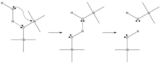 Hydrolysis chemical reaction of silica glass network, according to [33].