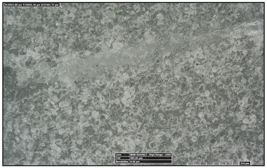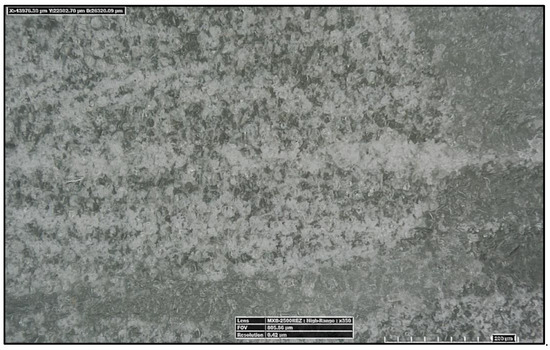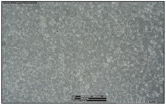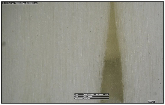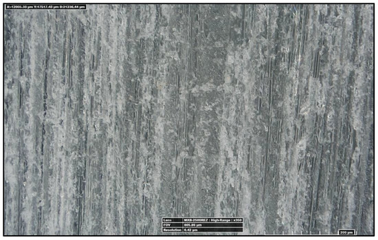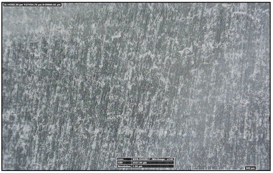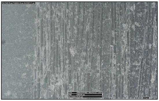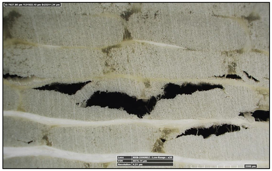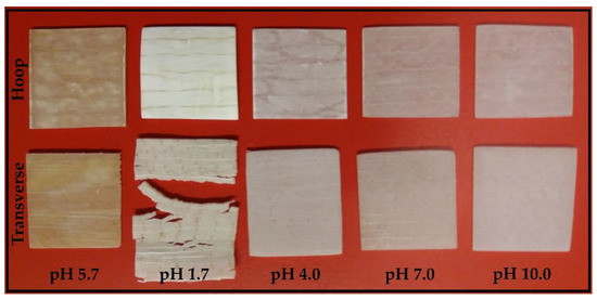 Composite plates with two fiber orientations (hoop and transverse) are shown in Figure 3, and microscopy images are shown in Figure 4, Figure 5, Figure 6, Figure 7, Figure 8, Figure 9, Figure 10 and Figure 11. GFRP plates were exposed to aqueous solutions of various pH values for a few days at room temperature. The composite specimens quickly degraded at pH 1.7 and were destroyed within a week, as seen in Figure 3. Thus, GFRPs should not be used in strongly acidic conditions. This observation is in full accord with a finding in another study that stated that many GFRPs fail catastrophically after a critical time of exposure to acids [17]. Furthermore, it can be seen that failure occurred on the surfaces of fibers, meaning that it was due to the failure of either glass fibers or the fiber–matrix interphase, which agrees with [26].