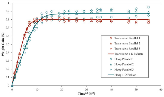 The modeling curves shown in Figure 8 were obtained using 1-D analytical solutions to Fick’s second law applied to anisotropic materials described by Crank [53] and, more specifically, to the plate case, as reported in [54]. Relations for calculating water contents w(t) were obtained by integration over the sample volume; these can be found elsewhere for orthotropic composite plates [54].