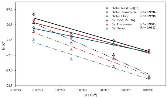 The graphing approach is shown in Figure 9. The obtained apparent activation energy of Si dissolution was 38.44 and 44.89 kJ/mol (using values) for hoop and transverse R-GFRPs, respectively, whereas for unembedded fibers, it was 53.46 kJ/mol [16]. The pre-exponential factor for Si dissolution was 6.82 × 10−1 g/(m2∙s) for both configurations.