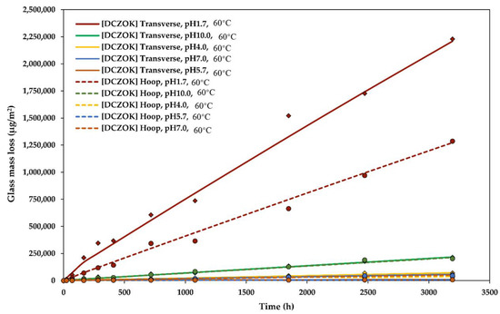 The glass dissolution rate constants were obtained via regression of the experimental data of GFRPs using the DCZOK model for Si and total mass loss at 60 °C and various pH values for both hoop and transverse orientations.
