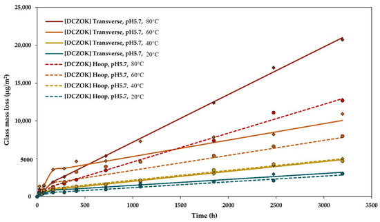 Similar to R-GFs [16], R-GFRPs also showed a hyperbolic dependence on pH. Transverse specimens degraded much quicker at pH 1.7 than their hoop counterparts, and their integrity was destroyed within a week, as seen in Figure 4. Thus, R-GFRPs should not be used in strongly acidic conditions. This finding agrees with an observation in another study that stated that many GFRPs fail catastrophically after a critical time when exposed to acids [17,56]. It is possible to obtain the pH influence on the activation energies of dissolution by rearranging the Arrhenius equation into the following form (Equation (22)):
