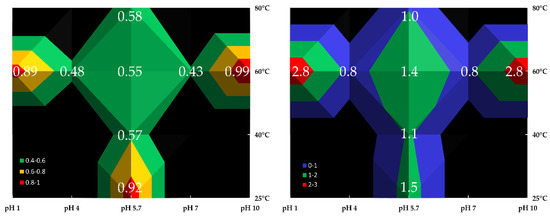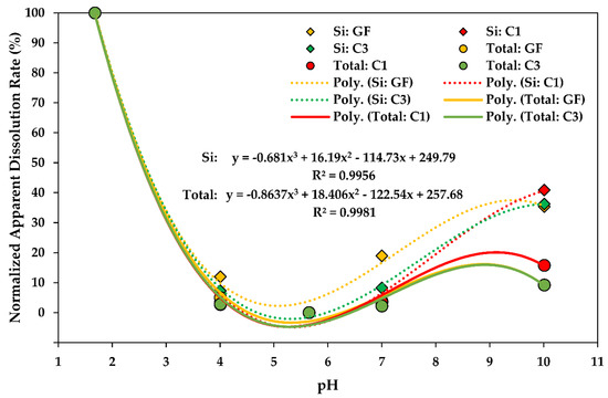 The pH function of the normalized activation energy of dissolution for R-glass [16] and the respective R-GFRPs studied in this work is shown in Figure 12. Normalization was performed with respect to activation energy at pH 5.65, which exhibited the lowest activation energy levels. It is commonly accepted that pH dependency can be approximated as a polynomial function [16,57].
