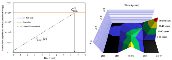 The estimated times to reach the saturation of degradation products inside the composite and the approach used to obtain it are shown in Figure 14. The time to reach saturation decreases as the temperature is increased. At pH 5.65, the estimated time to reach saturation at 20, 40, 60, and 80 °C is 24, 15, 8.5, and 1.5 years, respectively. Additionally, the time to saturate decreases as the environment becomes more acidic. At 60 °C, the estimated time to reach saturation at pH levels of 1.7, 4.0, 5.7, 7.0, and 10.0 is 1.5, 2.5, 8.5, 10, and 36 years, respectively.
