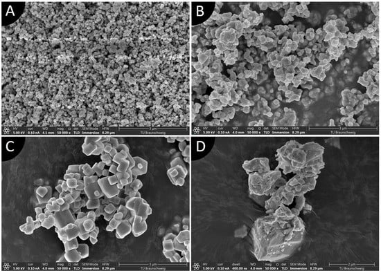 SEM images of piezoelectric ceramic particles used in this study (magnification ×50,000): (A) BTO; (B) KNN7; (C) KNN3.5; (D) PZT.
