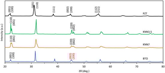 X-ray diffraction (XRD) was used to prove whether ceramic particles used in this study were indeed piezoelectric. The results are presented in Figure 2. The XRD pattern of the BTO ceramic reveals no splitting of the (002)/(200) peaks (Figure 2, shown in red), which is indicative of the piezoelectric tetragonal crystal phase. No splitting of the peaks suggests a cubic lattice structure for the ceramic, without piezoelectric properties [79,80]. The literature also reports nanosized BTO particles (<200 nm) with a cubic lattice structure [38,81,82], and in this study we used ≈122 nm BTO particles, further proving the possibility of no piezoelectric effect occurring in the BTO ceramic used in this study. The XRD pattern of the KNN3.5 particles, on the other hand, shows similarities to orthorhombic KNN patterns reported in the literature [68,70,83,84,85], which have piezoelectric properties. The intensity ratio between (220)/(002) peaks at about 1.52 also suggests a highly orthorhombic lattice structure [84]. KNN7 shows peaks at very similar 2θ degrees in the XRD patterns; however, the peaks are lower compared to KNN3.5. A decrease in the ratio between (220)/(002) peaks (a decrease from 1.52 to 1.1) suggests some co-existence of both orthorhombic and tetragonal phases [84], where both of them are piezoelectric. The XRD pattern of PZT used in this study fits the piezoelectric tetragonal phase pattern reported in the literature [86,87,88,89], with clear peaks in intensities at 21.6°, 22°, 43.9°, and 44.9° [88]. Therefore, only the BTO piezoelectric ceramic used in this study did not have piezoelectric properties, most likely because of the nano-scale particle size.