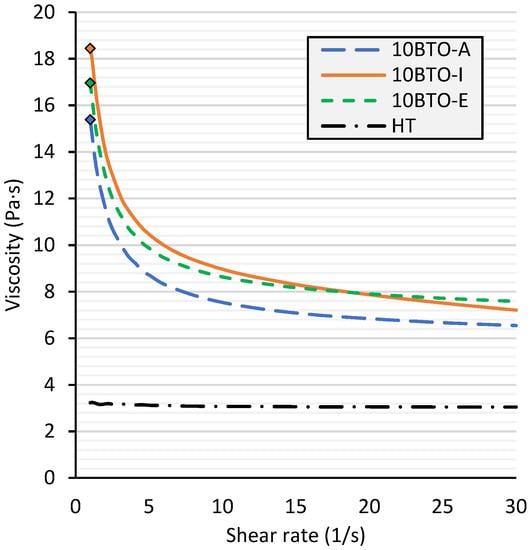 A further increase in the ceramic content would sharply increase the viscosity [5,91]. Interestingly, the change in viscosity of the BTO suspensions increases by roughly ten-fold when the ceramic content is increased by 10 vol.%. Other ceramics (bigger particles, non-spherical geometry, higher particle size distribution) do not follow this trend.