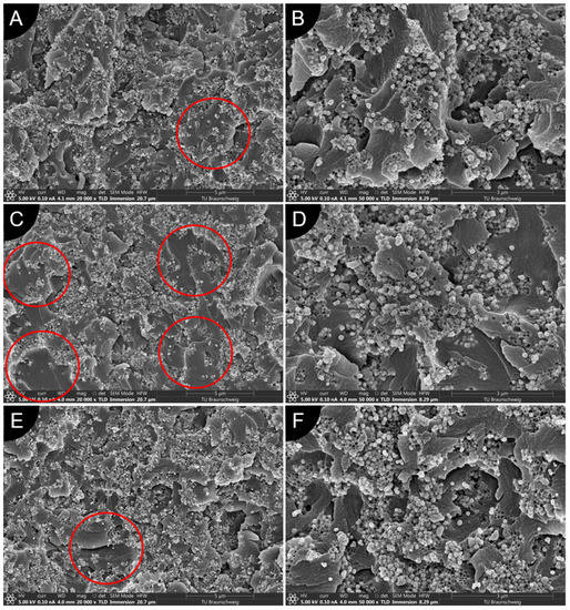 SEM images of cross-sections of solidified 10 vol.% BTO/photopolymer suspensions dispersed with different solvents: (A) acetone (mag. ×20,000); (B) acetone (mag. ×50,000); (C) isopropyl alcohol (mag. ×20,000); (D) isopropyl alcohol (mag. ×50,000); (E) ethanol (mag. ×20,000); (F) ethanol (mag. ×50,000). Red circles show areas without particles.