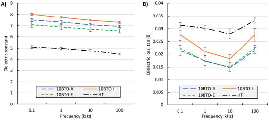 The literature reports the BTO ceramic itself not showing any significant dielectric losses up to MHz frequencies, indicating that any significant changes in the dielectric loss come from the polymer only [22]. Looking at Figure 11A, the result for the dielectric loss exactly follows the trend for the pure photopolymer resin, while the peaks and lows of the dielectric loss seem to be enhanced because of the addition of the BTO ceramic. In another study with three different UV-curable resins, different trends for dielectric losses over the frequency range were reported with the same ceramic loading [22], whereby the trend in terms of the dielectric loss is matrix-material-dependent, indicating that the composite matrix material is responsible for the dielectric loss behavior at frequencies in the <MHz range. In the literature, composites with 60 vol.% of 100 nm BTO particles in epoxy [39] and polyvinylidene fluoride (PVDF) [50] also showed higher dielectric losses at low frequencies (100 Hz), which decreased at average frequencies and started to increase again at higher frequencies (>10 kHz).