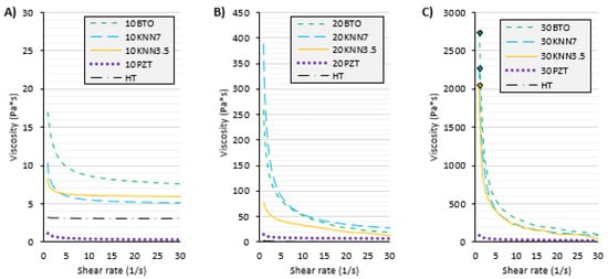 Figure 7 shows the viscosities of all manufactured suspensions, combined by volume loading for comparison. The viscosities of all suspensions, presented separately for every ceramic type, can be found in the Supplementary Materials (see Figure S1). In Figure 7C, 30PZT, 30BTO, 30KNN3.5, and 30KNN7 show values of 89.81 Pa·s, 2735 Pa·s, 2040 Pa·s, and 2270 Pa·s at a shear rate of 1 s−1, respectively. The results show that the smallest particles produce the highest viscosity (BTO composites) and the biggest particles produce the lowest viscosity (PZT composites). This is because of the increased particle surface area (therefore number of contacts between particles) when smaller particles are used, which is especially observable at lower shear rates. Similar observations are reported in the literature [56,91]. The results for both KNN composites also show higher suspension viscosity values for composites with smaller KNN particles. An exception is 20BTO, which shows lower viscosity compared to 20KNN7, although it contained two-fold smaller spherical particles. While the higher particle size distribution of KNN7 ceramic should lower the viscosity of the suspension, the irregular geometry of the particles increases their surface area and the probability of particle–particle interactions, which could cause higher viscosity. However, KNN7’s viscosity is above BTO only at 20 vol.%, meaning the result might be attributed to inaccuracies during measurement.