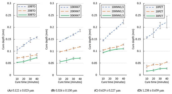 Curing depths of piezoelectric composites made with (A) BTO, (B) KNN7, (C) KNN3.5, or (D) PZT.